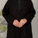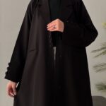 The Corporate Abaya features a structured lapel collar and titch buttons on the front, allowing versatile styling either open or closed. Thoughtfully designed front pockets add convenience, while the generous chest size and flared cut ensure freedom of movement. This abaya balances a tailored, professional look with effortless comfort for ambitious women.