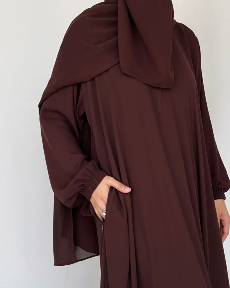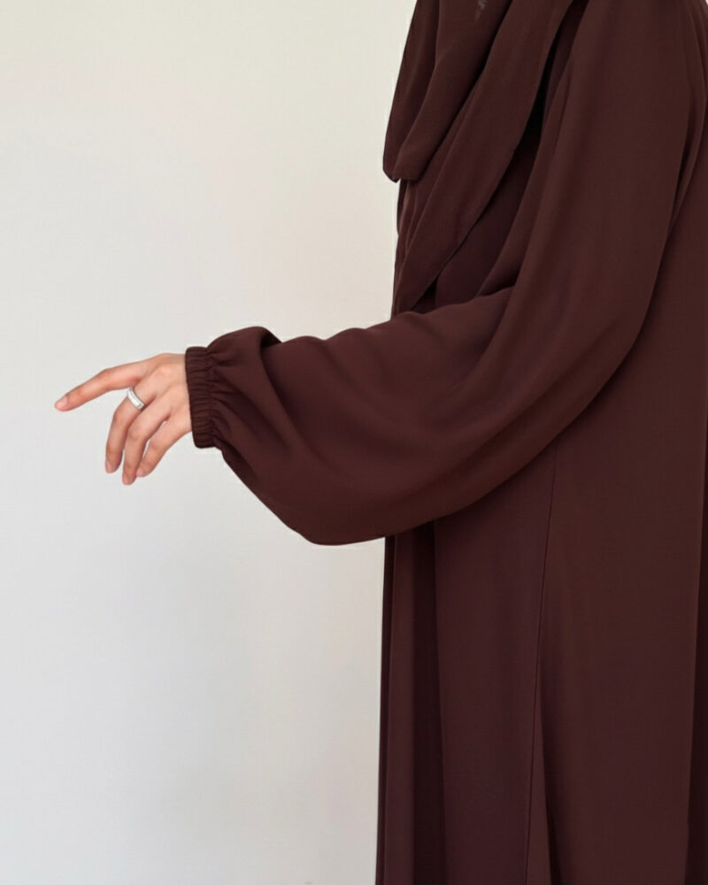 The abaya features side pockets with zippers. Moreover, these pockets keep your essentials safe while you’re on the go. The puff elastic sleeves come with a button. This ensures they won’t slip when you raise your hands.