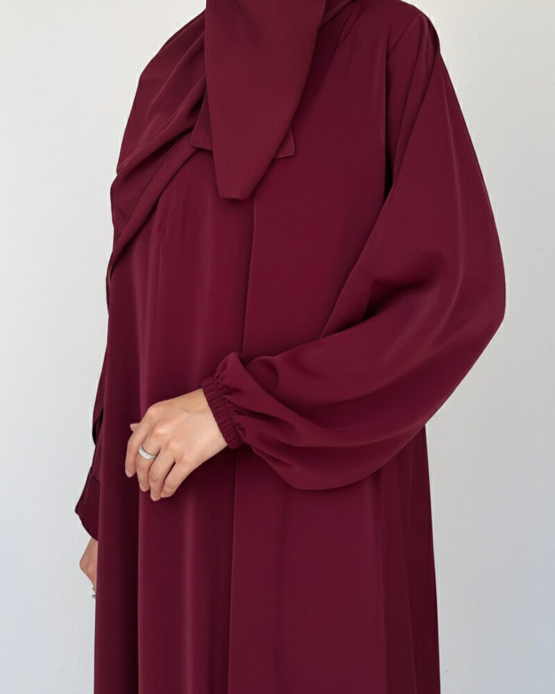 The abaya features side pockets with zippers. Moreover, these pockets keep your essentials safe while you’re on the go. The puff elastic sleeves come with a button. This ensures they won’t slip when you raise your hands.