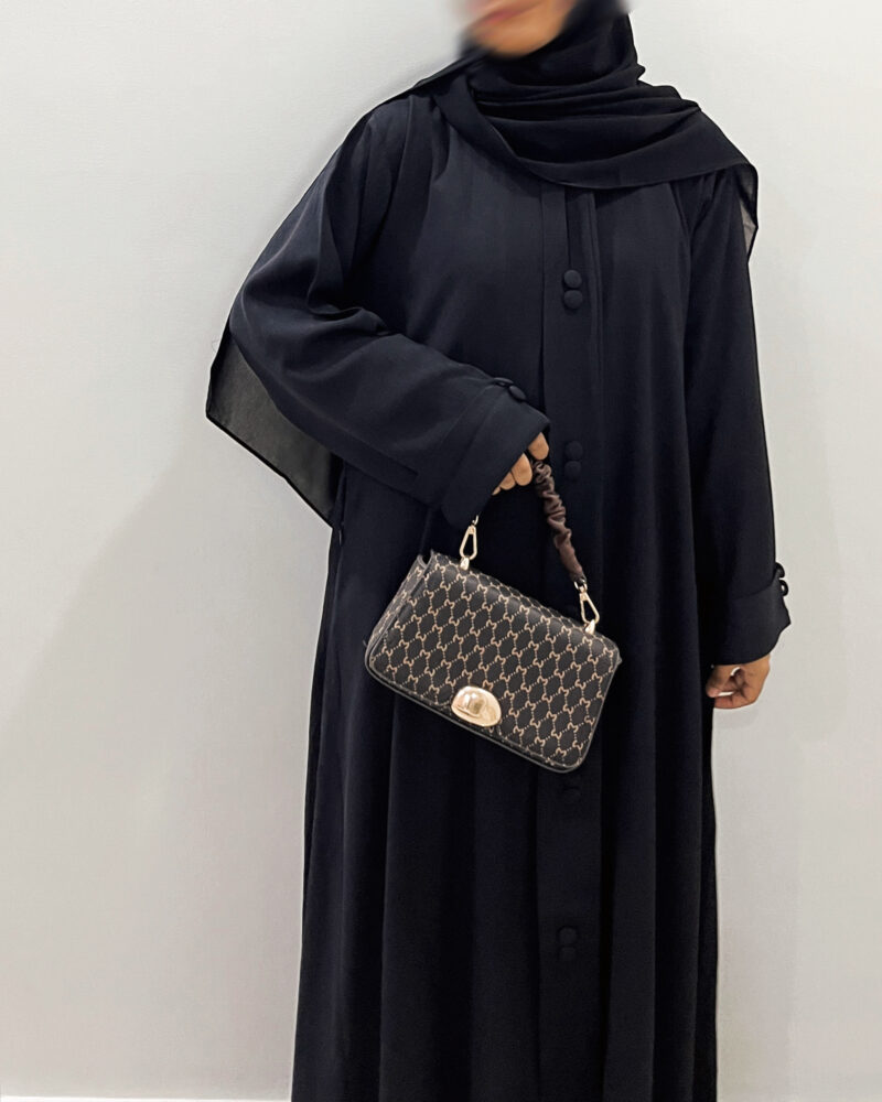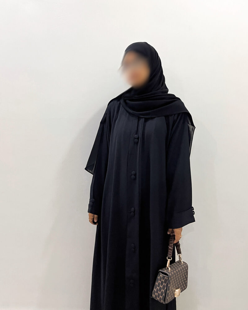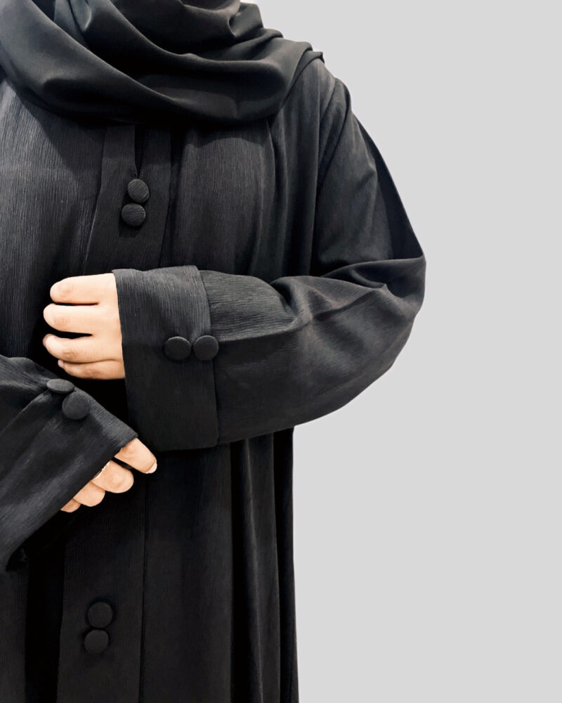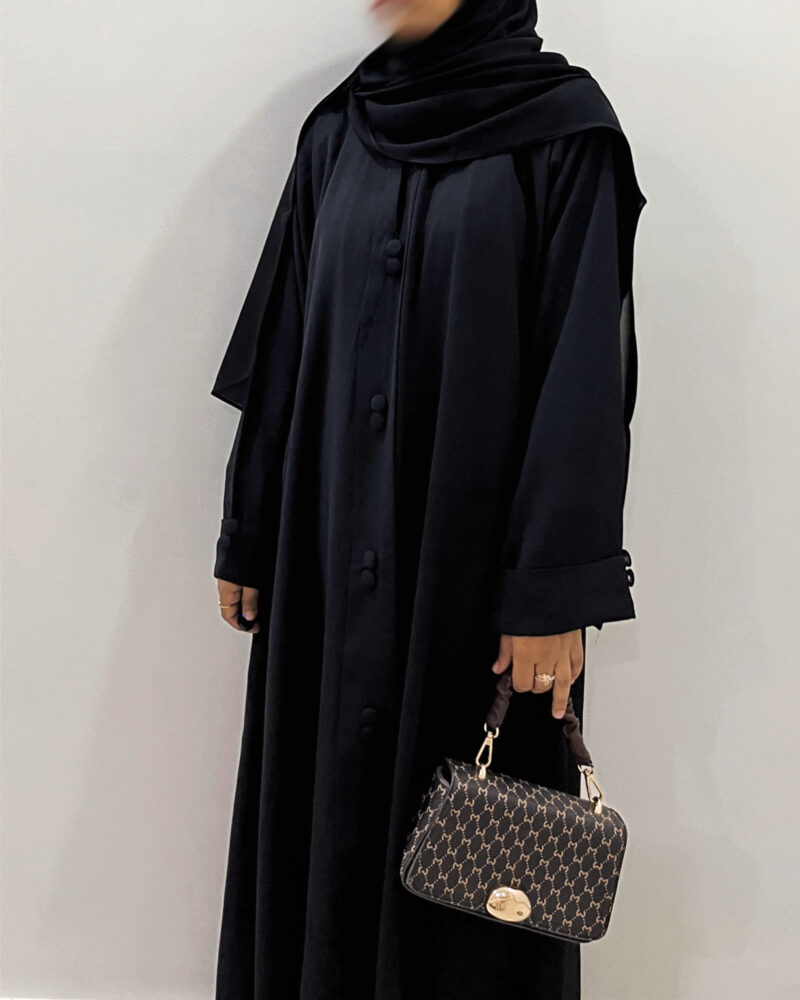 This Everyday Wear Abaya features a folded cuff with button accents, Front Closed, and an A-Line cut, Convenient one side pocket, and relaxed fit to move with you.